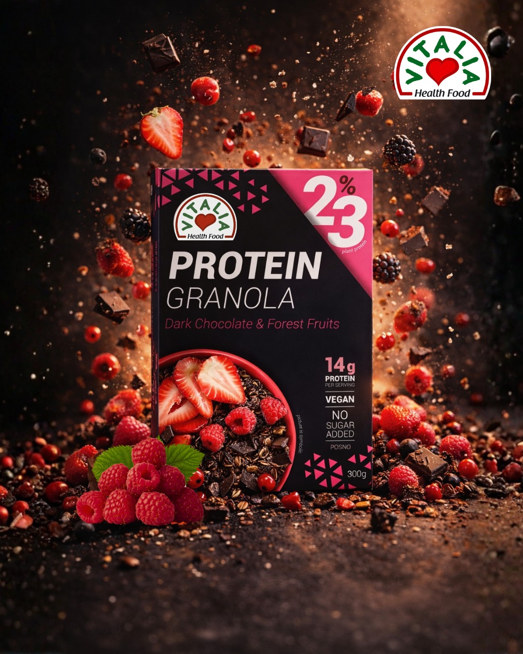 најновиот производ во нашата Протеинска линија – протеинска гранола. Оваа гранола е специјално направена со 23% растителен протеин од грашок и соја, што гарантира дека внесувате адекватна количина на протеини во секоја порција.